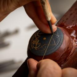 El proceso de creación de cualquier pieza de damasquino es lento, arduo, tiene mucho trabajo y no hay dos piezas iguales. El proceso comienza por dar forma a la pieza de hierro que se quiere decorar. Posteriormente, esa pieza es marcada creando los surcos, líneas y formas que va a tener la pieza con un buril o una cuchilla. Una vez trazado el diseño, con la mano, se incrusta el hilo de oro o láminas de seis micras con un punzón de base plana. Tras incrustar el oro en las hendiduras, con otro punzón más ancho y un martillo, llamado botador, el artesano procede a fijar las láminas e hilos de oro. Finalmente, una vez concluida la pieza, se somete al pavonado al fuego (para obtener el tono negro del fondo y el rojizo de la decoración), procediéndose después al repasado, bruñido y montado de la misma en el objeto que se desea realizar.