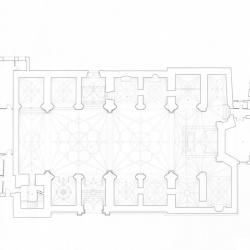 La planta es gótica y los soportes son clásicos, con medias columnas con retropilastras que presentan excesiva altura hasta alcanzar la pequeña imposta que recorre todo el edificio a la altura del arranque de las nervaduras góticas de las bóvedas.