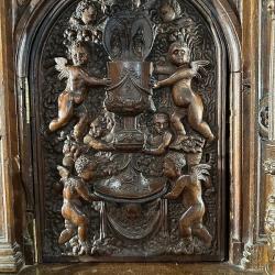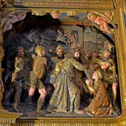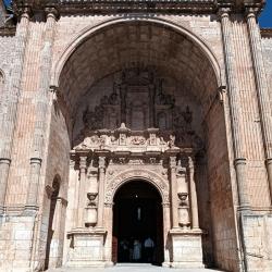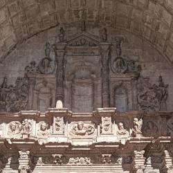 La entrada principal se sitúa en el lateral sur de la iglesia, obra de Esteban Jamete que se encargó de ella hacia 1550. Se compone de un gran arco triunfal de medio punto que sobresale de la fachada y llega hasta la altura de la cornisa del edificio, presentando casetones en el intradós y a un lado y otro, doble columnata estriada sobre base de sillería. Al templo se accede por una puerta en vano de medio punto, con dovelas y flanqueada por columnas corintias pareadas entre las cuales existen dos plantas de hornacina con nicho de conchas. En el segundo cuerpo sobre la imposta de separación, ménsulas que soportan una balaustrada rica en decoración. Por encima se pueden apreciar tres hornacinas, las laterales más reducidas y un frontón de roeles y acróteras remata el conjunto.