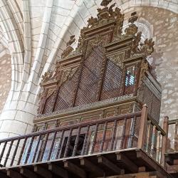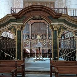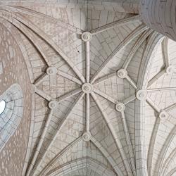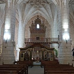 Interiormente se trata de una iglesia columnaria, de planta de salón con tres naves, cubierta con bóveda de crucería cuyos nervios arrancan de los fustes de las columnas, al carecer estas de capitel. En la nave central, los nervios de las bóvedas forman estrellas radiadas, mientras que en las laterales la nervatura y la plementería son más sencillas.