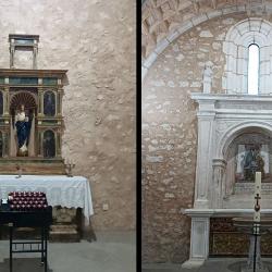 Sostiene la techumbre grandes columnas circulares lisas realizadas en sillería y apoyadas en altas basas molduradas formando anillos. Al igual que el exterior todos los vanos aparecen ribeteados con piedra de sillería que contrasta con el sillarejo de los muros.